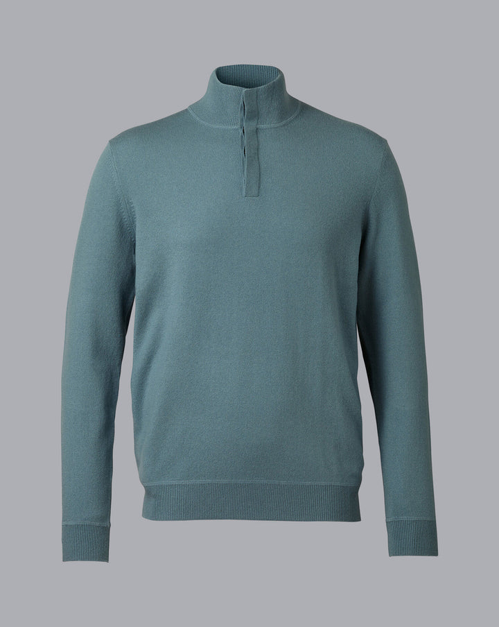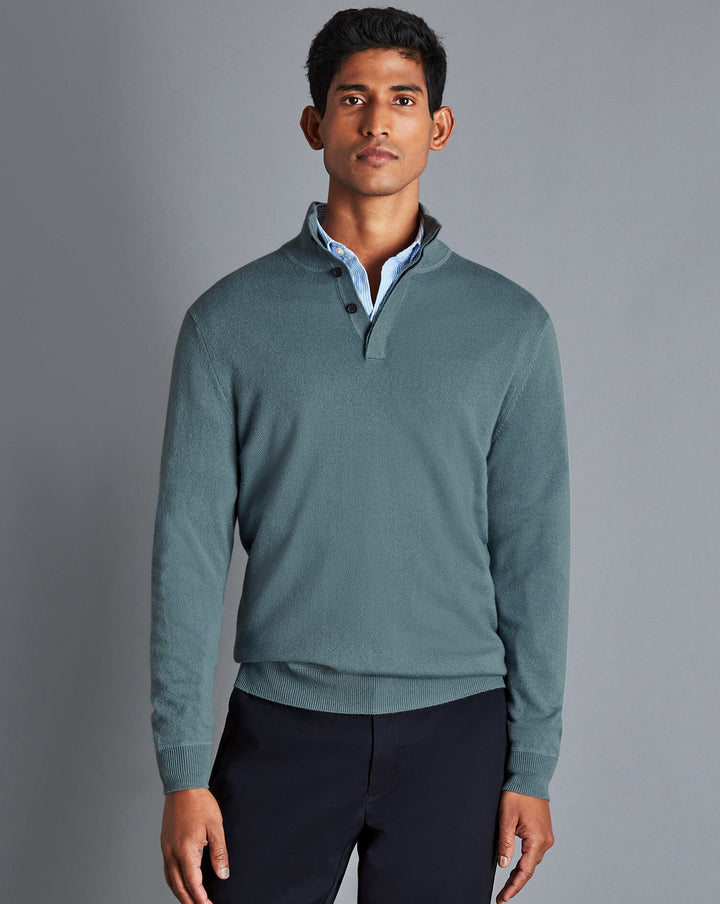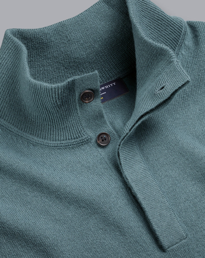 Pale Teal Green Merino/Cashmere Button Neck Jumper